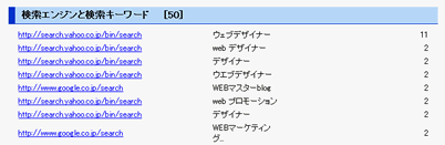 「検索サイトからのアクセス」は主要検索サイトからのアクセスをキーワードと共に表示します。検索されたページ毎の統計データとなりますので、同じ検索エンジン、同じ検索キーワードでも、閲覧者が表示件数を自分で変更している場合は別統計となります。