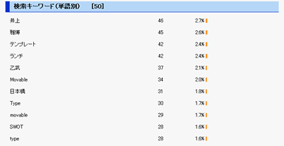 例えば「アクセス 解析」は「アクセス」と「解析」に分けられますが、「アクセス解析」と続けて入力した場合は分けられません。見出しの[50]と表示してあるのは表示件数です。