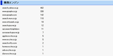 「検索エンジン」では検索エンジン別アクセス数を表示します。どのような検索エンジンから多く訪れるかを確認できます。