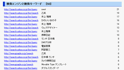 「検索サイトからのアクセス」は主要検索サイトからのアクセスをキーワードと共に表示します。検索されたページ別の統計データとなりますので、同じ検索エンジン、同じ検索キーワードでも、閲覧者検索結果の表示件数を自分で変更しているなど、別URLの場合は別統計となります。見出しの[50]は表示件数です。