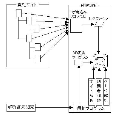 貴社のサイトの各ページに一行のスクリプトを貼り付け、そのスクリプトがいちにのさん.comのアクセス解析サーバーにログデータを書き込みます。ログの解析はそのログデータをデータベース化することにより行います。