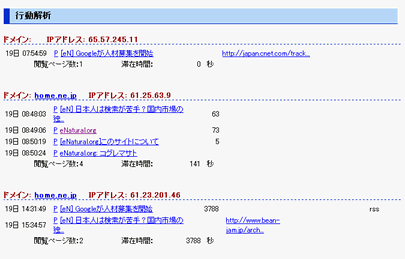 訪問者がどこから来たのか(検索エンジン? どこかのリンク集?)、そしてどのページを見たのか。訪問者の行動が手に取るように分かります。